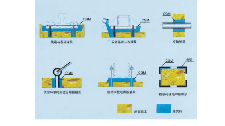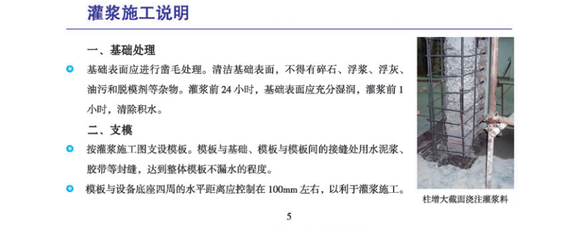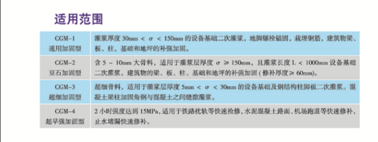 灌漿厚度30mm<δ<150mm設(shè)備基礎(chǔ)二次灌漿,地腳螺栓錨固,栽埋鋼筋,建筑物梁、板、柱、基礎(chǔ)和地坪的補(bǔ)強(qiáng)加固。