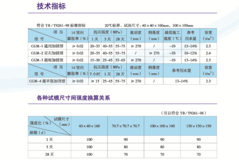 技術(shù)指標(biāo) 符合YB/T9261-98標(biāo)準(zhǔn)指標(biāo) 20℃標(biāo)養(yǎng)、試塊尺寸:40×40×160mm,100×100mm